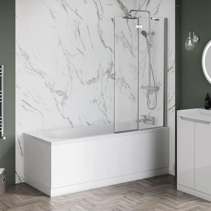 Complete your bathroom design with the Aqua i folding bath screen, suitable for straight baths. Showcasing a fixed panel and folding smaller panel, the quality hinges provide a smooth rotation that not only provide a larger gap to enter the bath, but also function as a deflector to minimse water splashes from within the showering space.