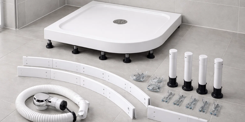Acrylic remains widely used across UK homes due to its lightweight structure and practical installation benefits. These acrylic trays suit upper floors, timber joists, and renovation projects where reduced load matters. Many designs include adjustable legs, allowing installers to manage uneven bathroom floor surfaces while protecting the waste pipe connection below.