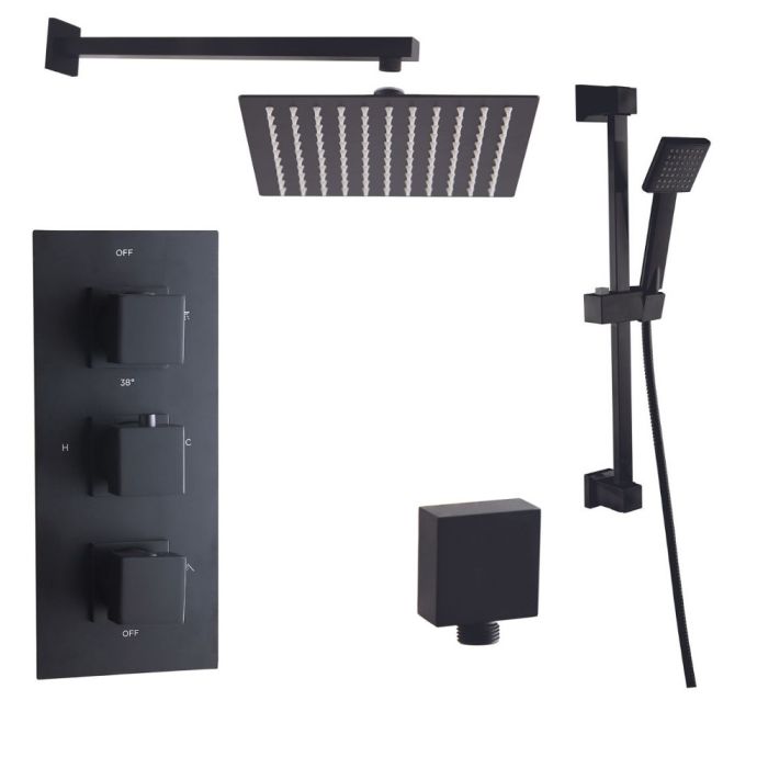 ✔ Matt Black finish ✔ Includes fixed head ✔ Choice of shower arm ✔ Multi function handset ✔ Thermostatic cartridge